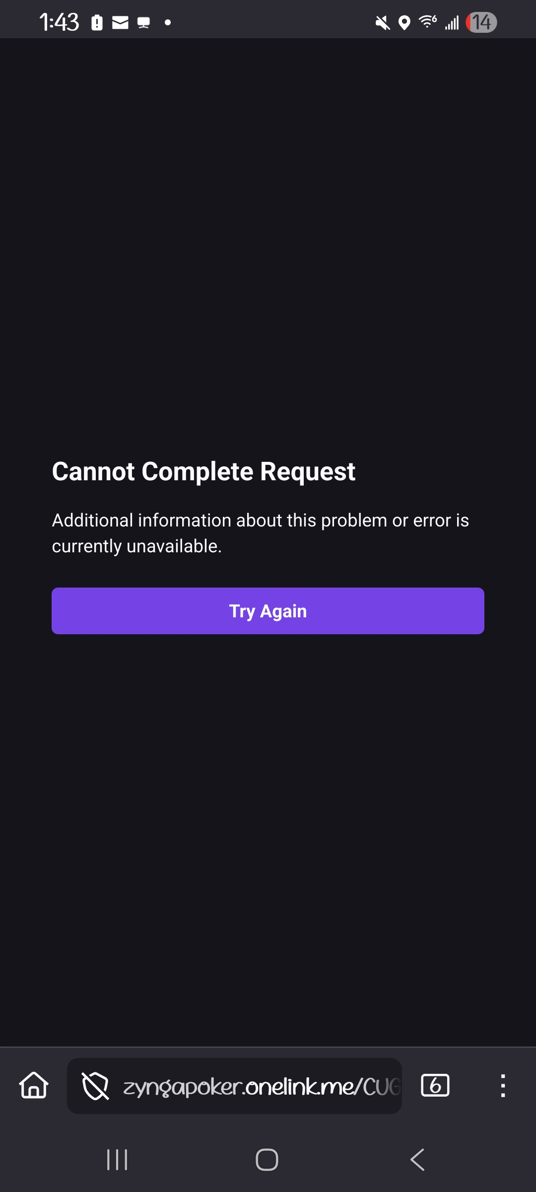 I have the Zynga app for poker downloaded on my Samsung Galaxy S21 Ultra. I rwceive emails frrlom them that give me free coins. To receive those coins I click on the "Claim Now" button. Side note: There was never a problem with collecting coins from the app when I clicked on that button in the email I received. I should also say that this version of the ZyngaPoker Plus app I did not download from the Play Store like the original version. The "Plus" version let's players get more coins or chips for the cost rather than being redirected to their online store to get those better deals. I now get the message: "Cannot Complete Request. Additional info about this issue or problem is currently unavailable". Then the "Try Again" button. Which if you click the same error appears. I did notice that there is a "\" through the badge that is before the URL address of "zyngapoker.onelink.me/COG". I am not able to see if there is anything else passed those last letter. I click on the badge and turn off the Enhanced Protection for that website click the "Try Again" button but same issue...cannot complete blah blah blah. I even turned off the Enhanced Protection at the app level but no change. I tried to give my exact scenario but if anything is unclear please ask and I will follow-up. Thanks in Advance Marlee40