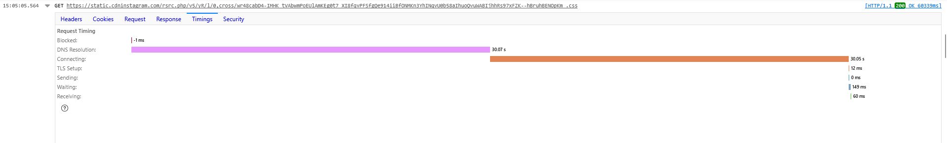 As I was trying to debug this, I discovered that the DNS resolution and connection timings are just over 30 seconds (see the attached image). This is highly unusual.