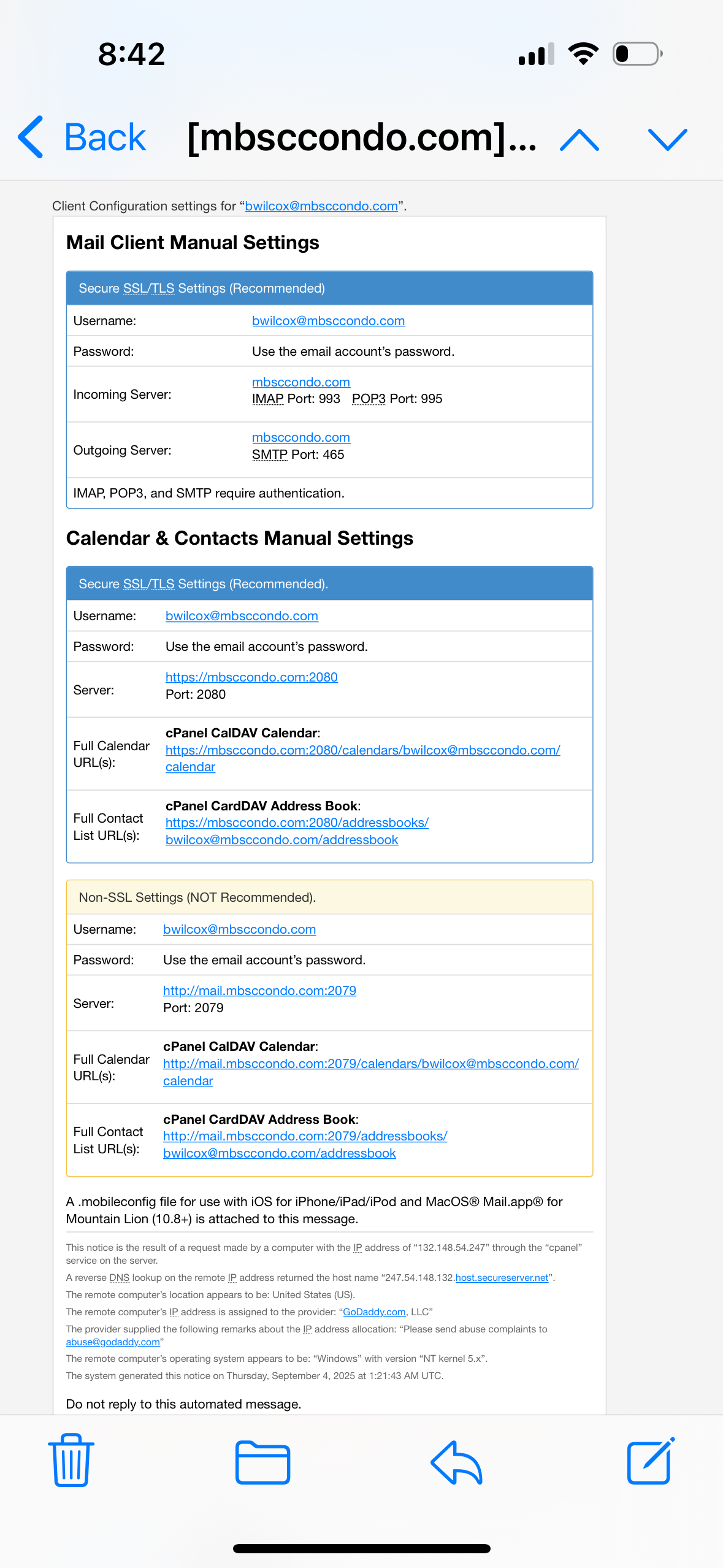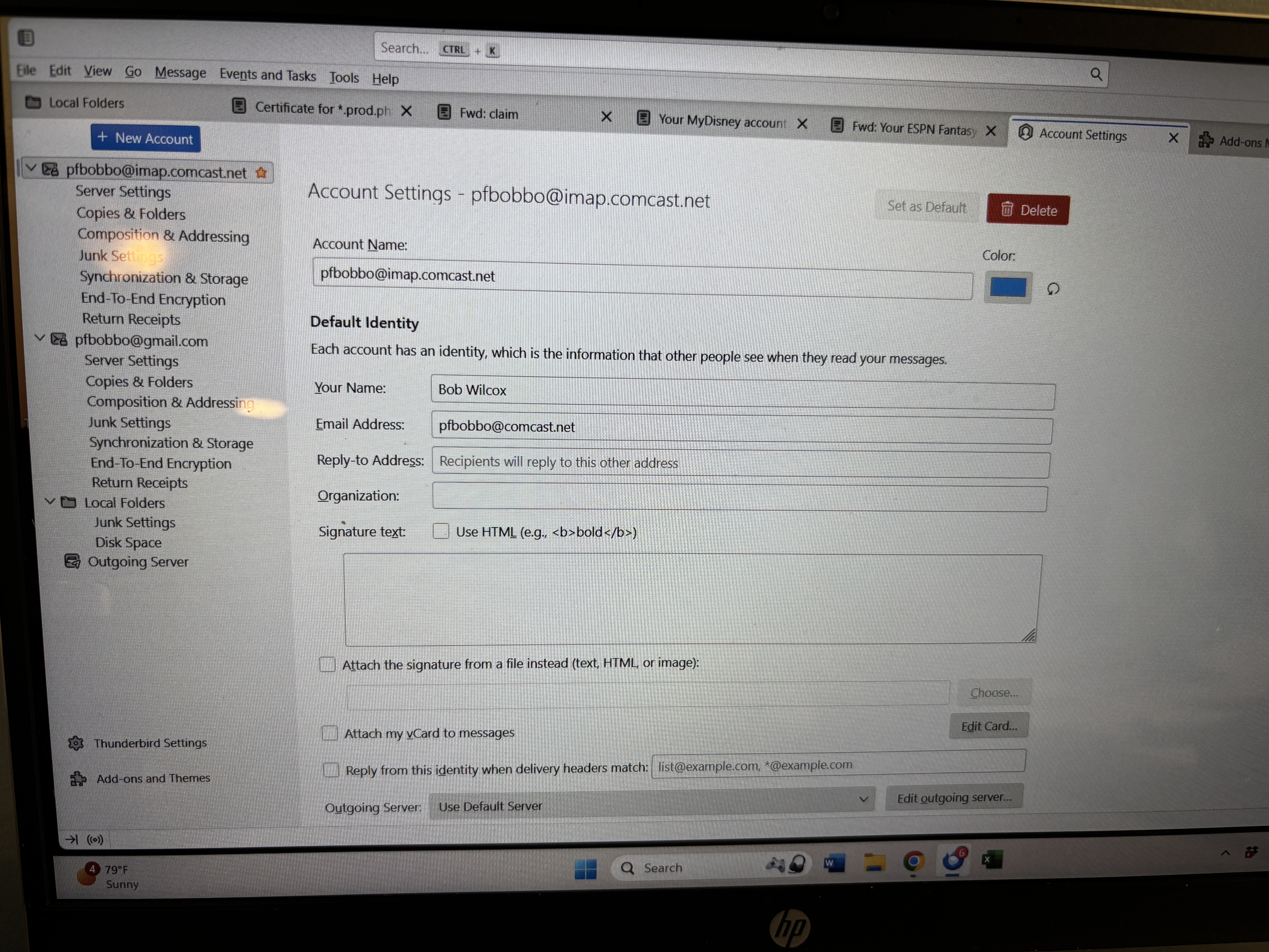 Wait, your screenshots suggest that you have not been able to set the account up, but you say that you can send messages with it. One screenshot shows a Comcast account and a gmail account but not mbscondo account. How are you sending messages? Do you mean on your phone?
