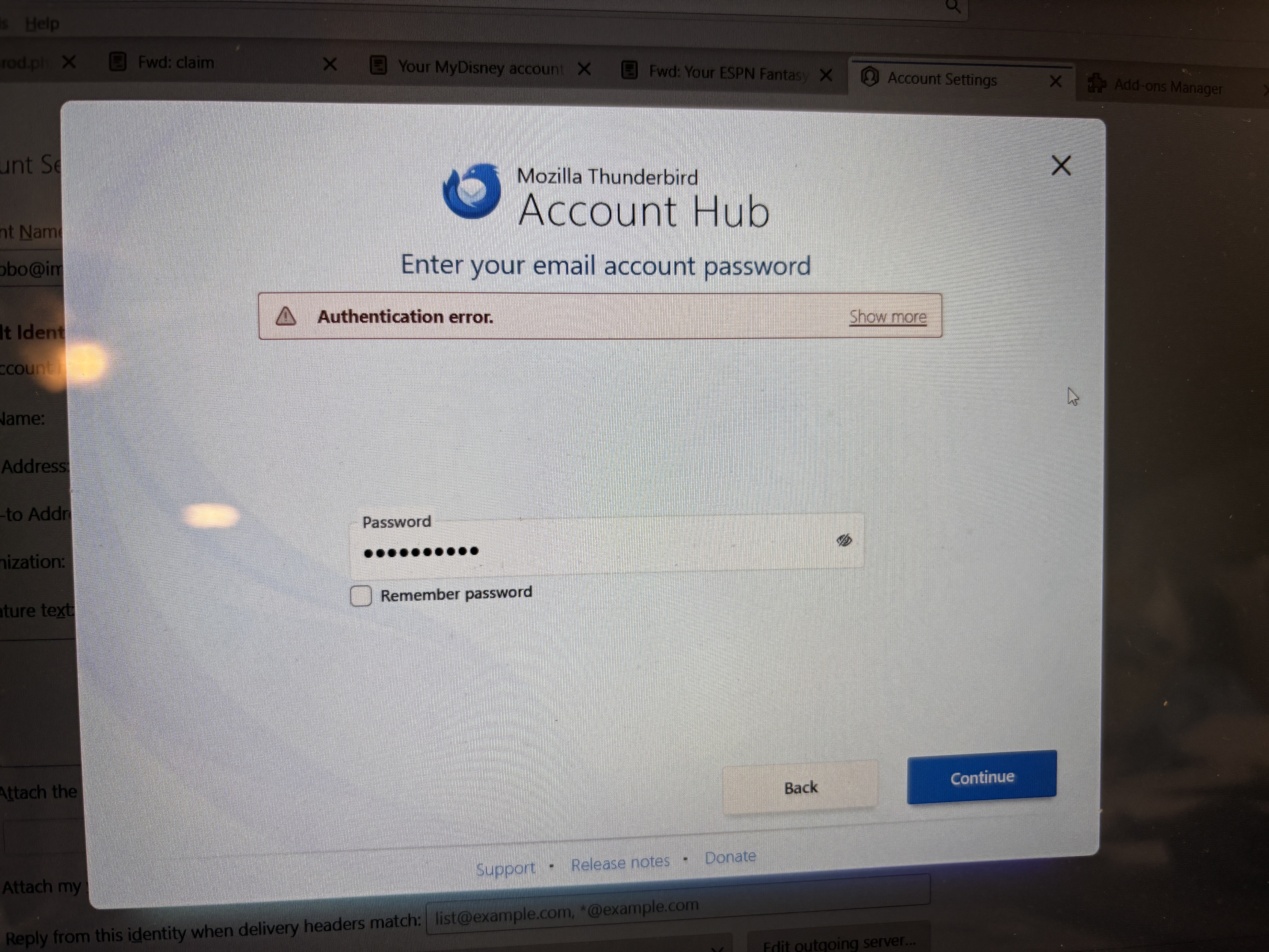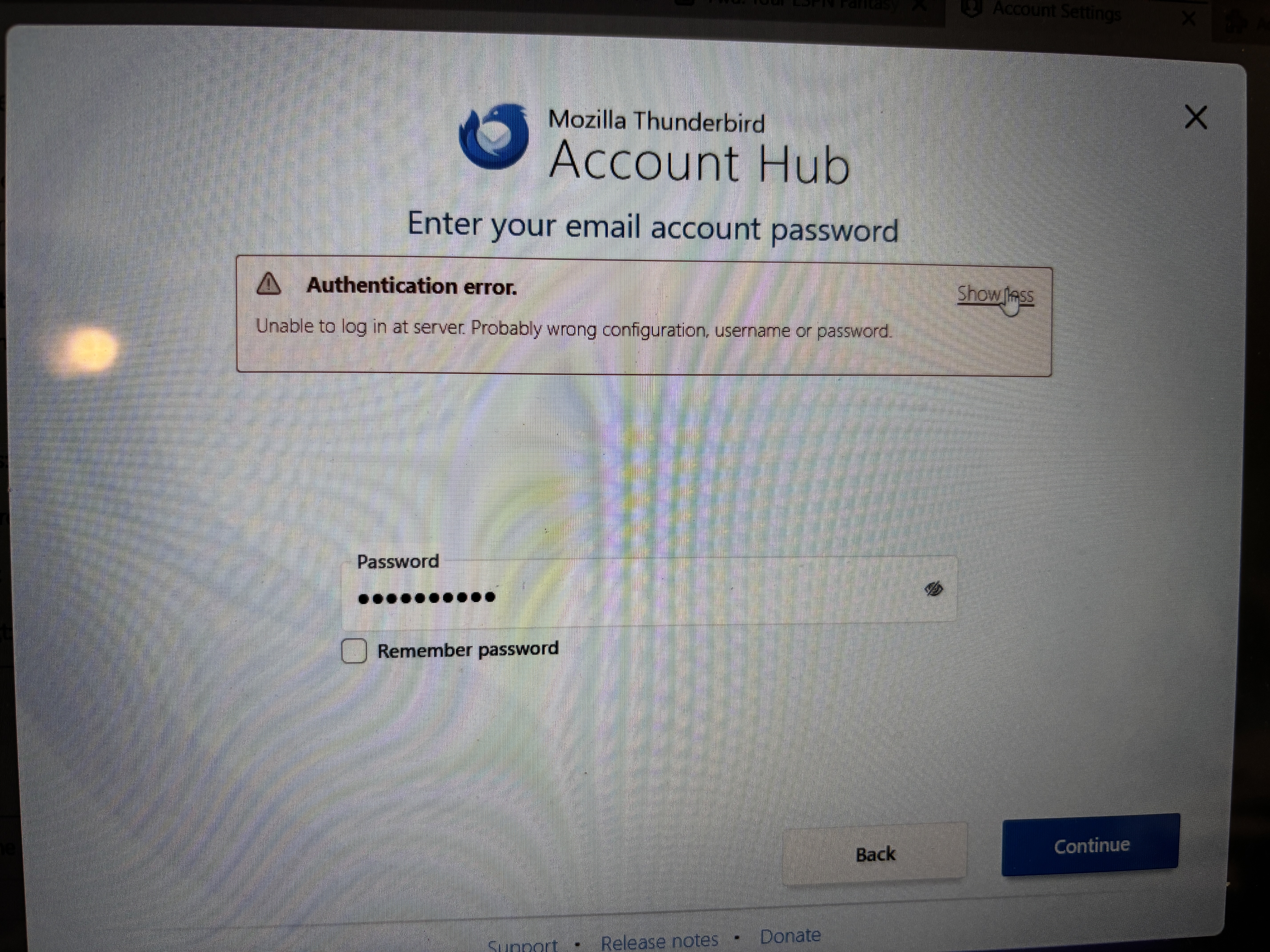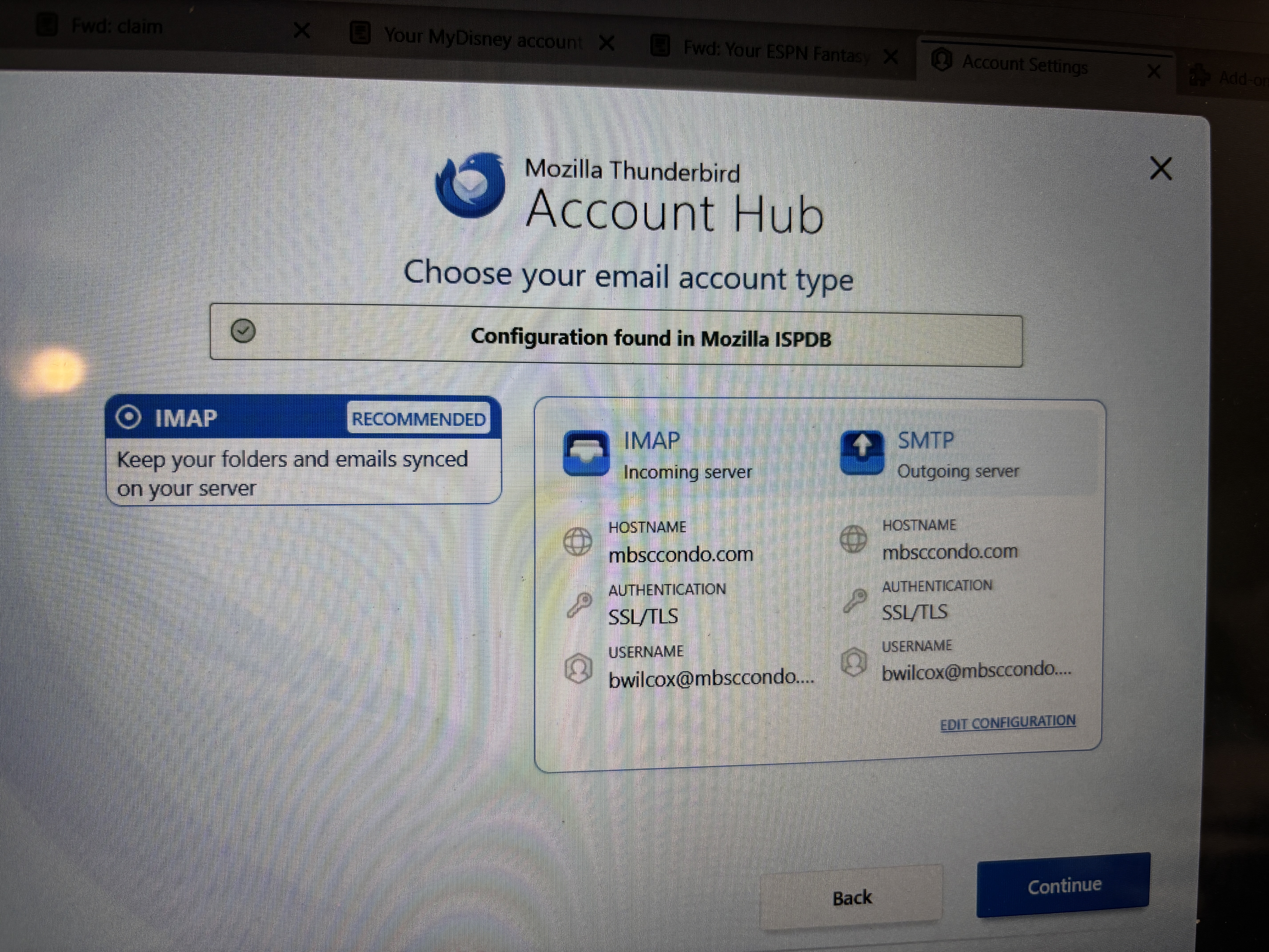 Hi there......I have been attempting to get my TB to work on my thru my hosting web provider but have not been successful. I have used all of the incoming server and outgoing server suggestions and have not been able to receive emails with TB on my desktop. I can send and receive on my iphone but not thru TB. I have also tried manual config but no cigar. I was hoping to call TB support but I see that is not possible, only thru community support. If anyone can help me I would greatly appreciate it. I guess I will look to see if I get any responses thru my gmail acct which is pfbobbo.