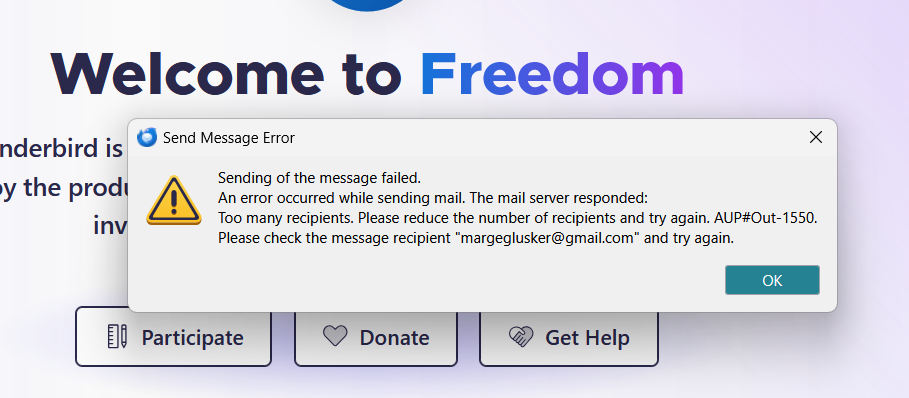 In the last few weeks I can't send an email list using Thunderbird on my PC or Apple mail on my IPAD to more than 5 people and it's not the client server or my security apps. For Thunderbird I get a "1550 error", even for a small list of 8 people. The 6th plus rest of the addresses always come up as not valid even though I can send a singular message message to each of the addresses. For OS I get " X...is not a valid email address and has been rejected by the server." 1) I've talked to server support and when I use their web email (a pain), everything goes through. I have enough space on the server. I'm supposed to be able to send a list with 99 people on it. They say this test proves it is Thunderbird's problem but I wonder why it is happening on OS with Apple mail, too. 2) I talked to my security company McAfee and when we deleted the app I still had the problem. 3) I deleted Thunderbird from my PC and added it back again and still had the problem. 4)The server company suggested that I talk to Thunderbird about the PC and for OS delete the Apple mail app completely , not just remove the bothersome account and then try with a new app. This seems scary to me, as I will lose years worth of collected address and contacts. Thanks if you can help.