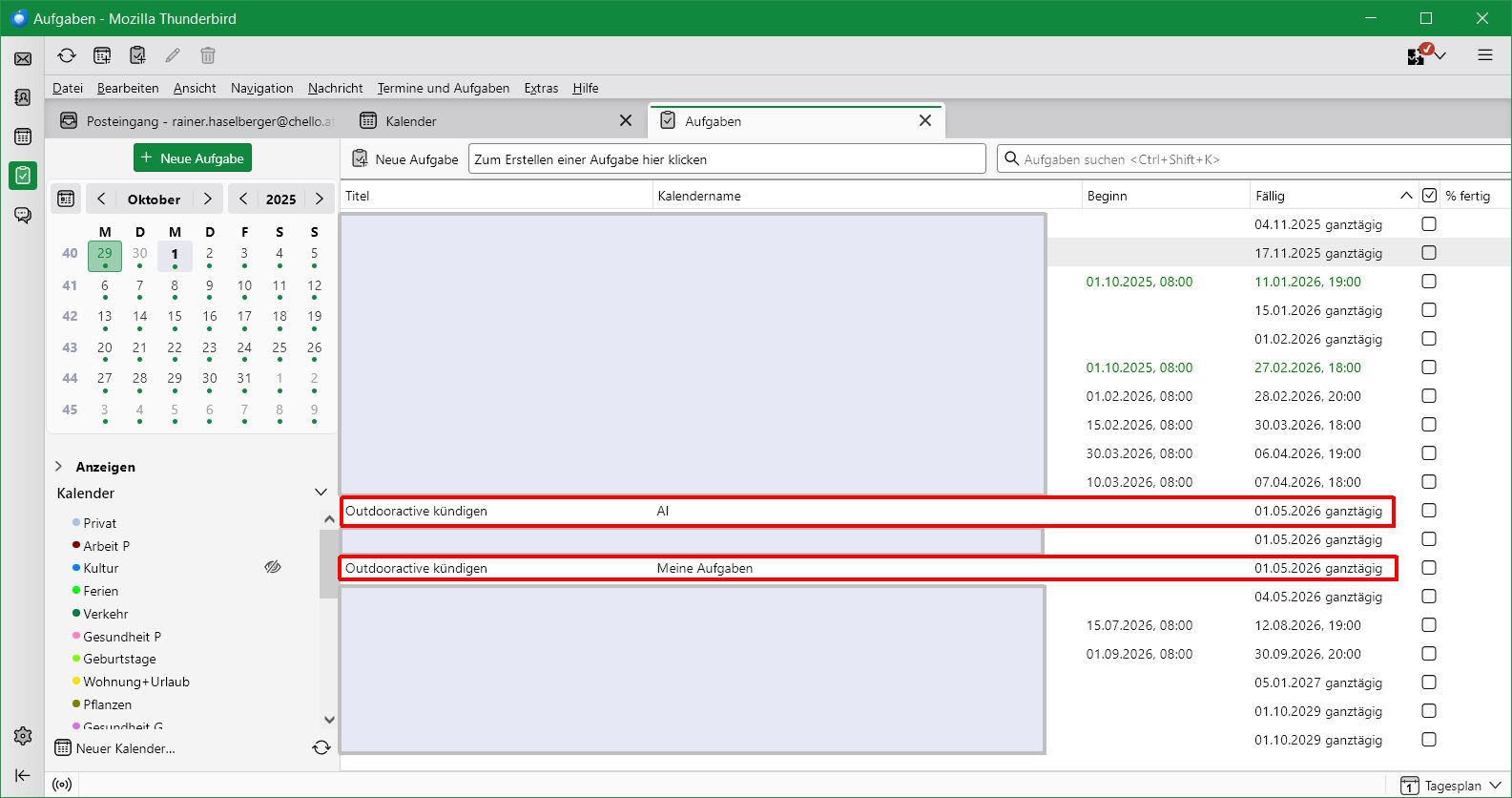 When moving a task from "meine Aufgaben" (my tasks) to another Gmail calendar tasklist ("AI"), a ghost entry, which cannot be completed or deleted, remains in the old Thunderbird tasklist "meine Aufgaben". Thus I have many tasks twice in different Thunderbird-calendars, but only once in Gmail.
