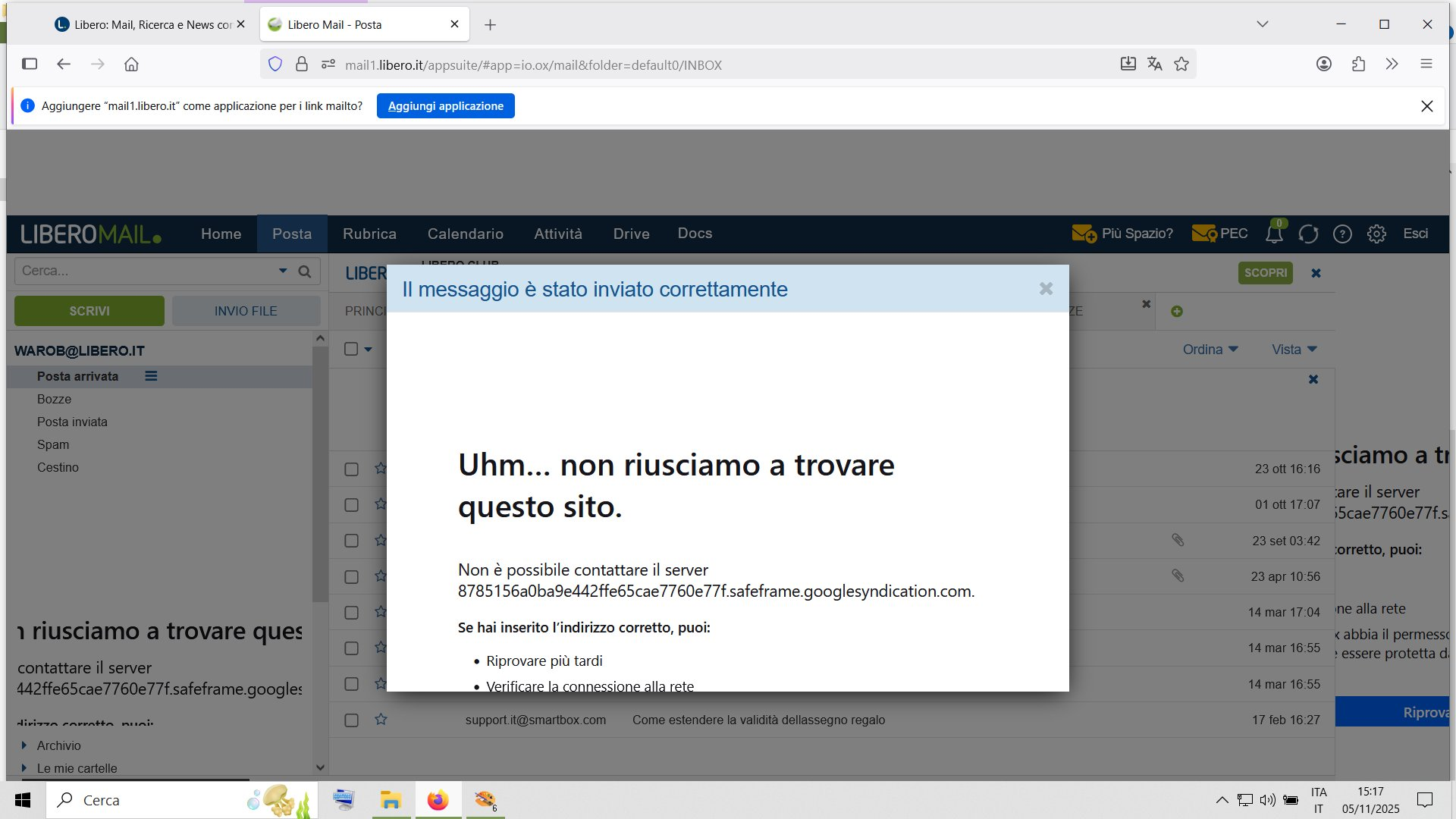 Il messaggio di Libero mail è la riga con lo sfondo azzurro. L'errore è sotto è perché è fallito il caricamento di una pubblicità.