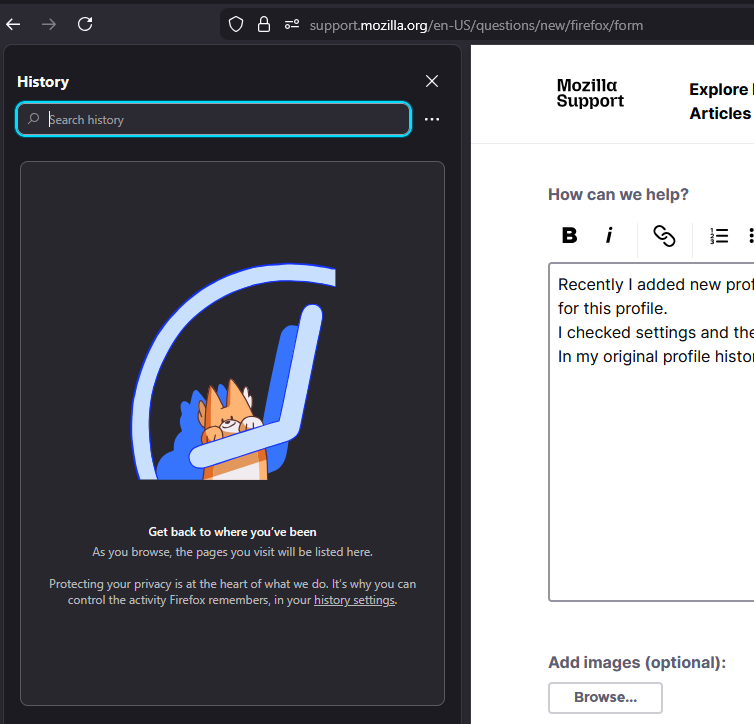 Recently I added new profile to Firefox. Since then History tab does not work. There is no pages in History tab. In settings History is enabled. This function works properly in my original profile.