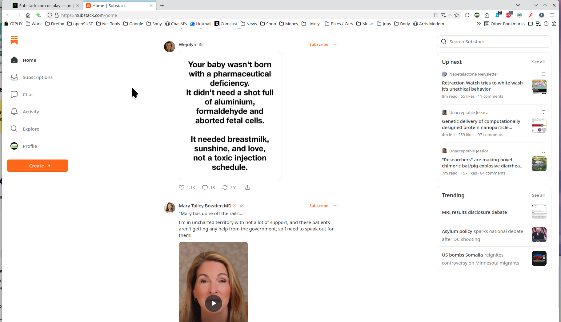 Over the past couple of days, I am no longer able to view content on the Substack.com website. If I switch to the Edge browser, I get the usual view. I've tried turning off Extensions and other typical issues. So far, none have corrected the problem.