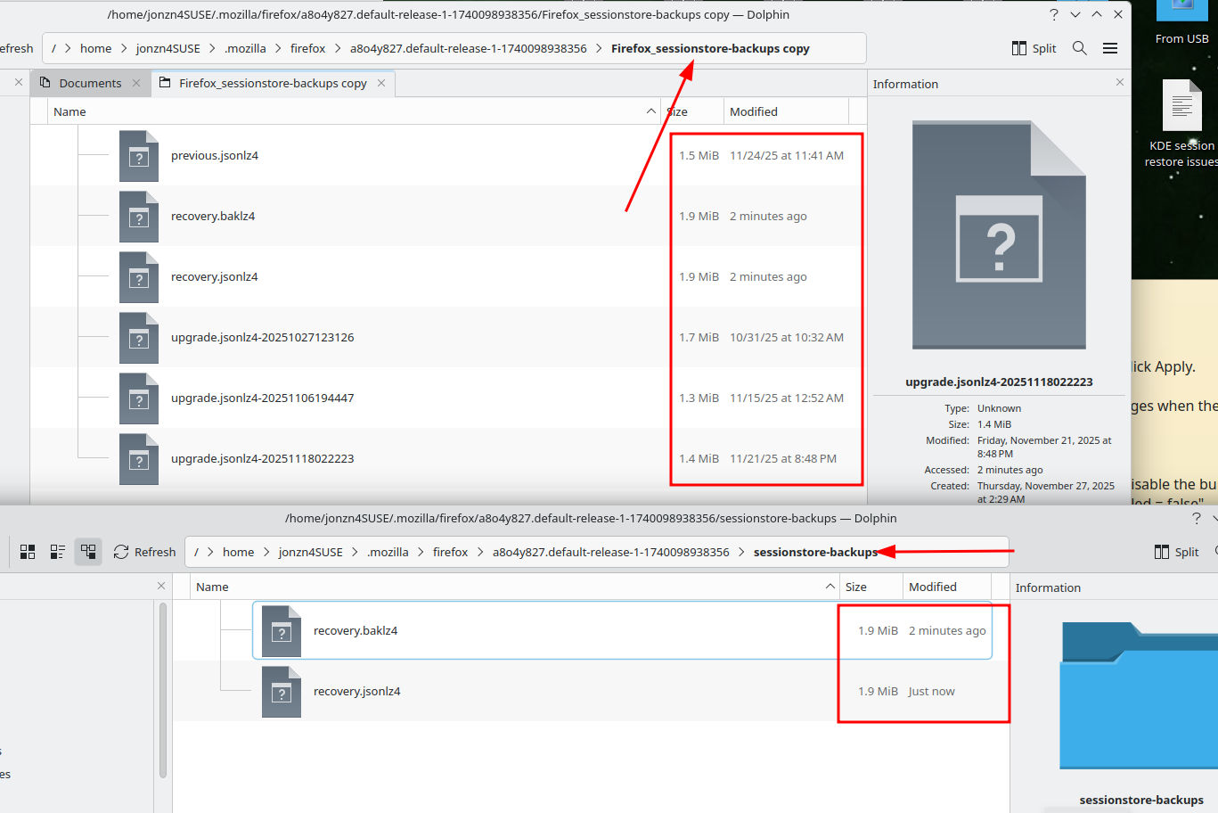 Show your files in detail view. Sometimes either with an update or restart, I've seen where the files in the sesssionstore-backups folder get reset which is why I make a copy of the folder. see old screenshot