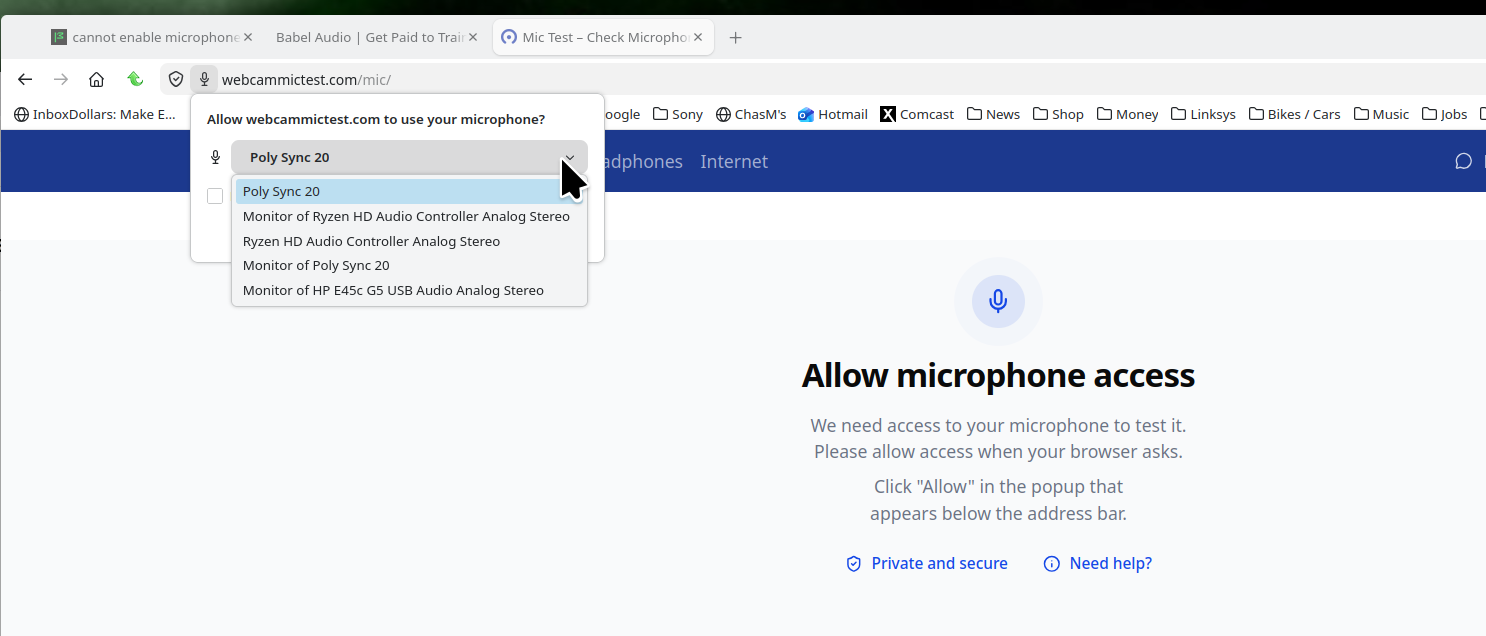 My microphone (stand alone) is not being detected by the website "Babel Audio" as I am attempting to connect on the website to test out my audio. My microphone does work for other programs on my computer and my taskbar does show that my microphone is connected correctly.