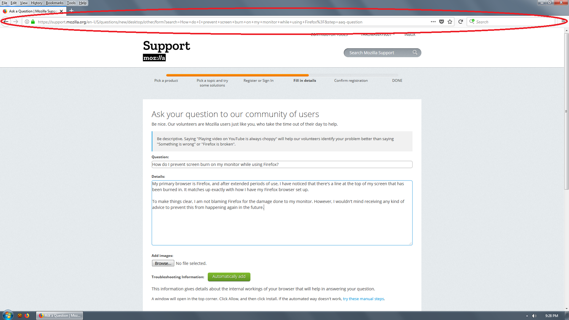 My primary browser is Firefox, and after extended periods of use, I have noticed that there's a line at the top of my screen that has been burned in. It matches up exactly with how I have my Firefox browser set up.