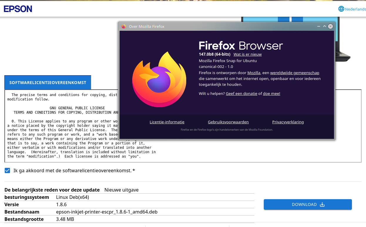 Firefox 147.0b8 (Snap) - downloading Linux packages failing ....