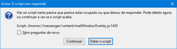 Desde la última actualización de Thunderbird (45.6.0), la aplicación tarda mucho en arrancar (unos 30 seg. de media). Aparece la página Home, mostrando las carpeta existentes, y tarda esos treinta segundos en solicitar la clave de acceso. Junto con la solicitud de la clave, se abre una advertencia de que un script no responde: Script: chrome://messenger/content/MailWindowOverlay.js:1430 y pide continuar o detener el script. pulsando indistintamente cualquiera de las opciones, la aplicación arranca y funciona perfectamente. Esto sucede con Windows 10 Home. En un portatil tengo instalada la versión W10 Pro y la v45.6.0 de Thunderbird funciona perfectamente. Desinstalé, reinstalé, lo intenté con versiones anteriores de Thunderbird y me dá el mismo fallo. Antes de reinstalar, eliminé las carpetas de Thunderbird del usuario, pero no hay ningún cambio. ¿Tiene alguien la solución al problema?