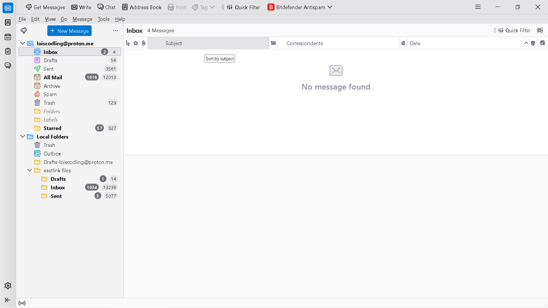 Thanks, Matt. I've attached a screenshot. You can see that there are no files to be found in the inbox, though It now shows 4 files, 2 unread. I tried to move 2 emails from "All Mail" to "Inbox" to see if that might break the problem, but no joy. Those 2 files now are recorded as being in the Inbox, but are not visible in any way I have tried. I checked to be sure, but my wife has no filters set. In all the other folders, you can see, access and read the emails and move them around. I'm beginning to wonder if the only way forward is to disconnect from Proton, delete all the files from her computer and then reconnect to Proton and try again to download from it. Don