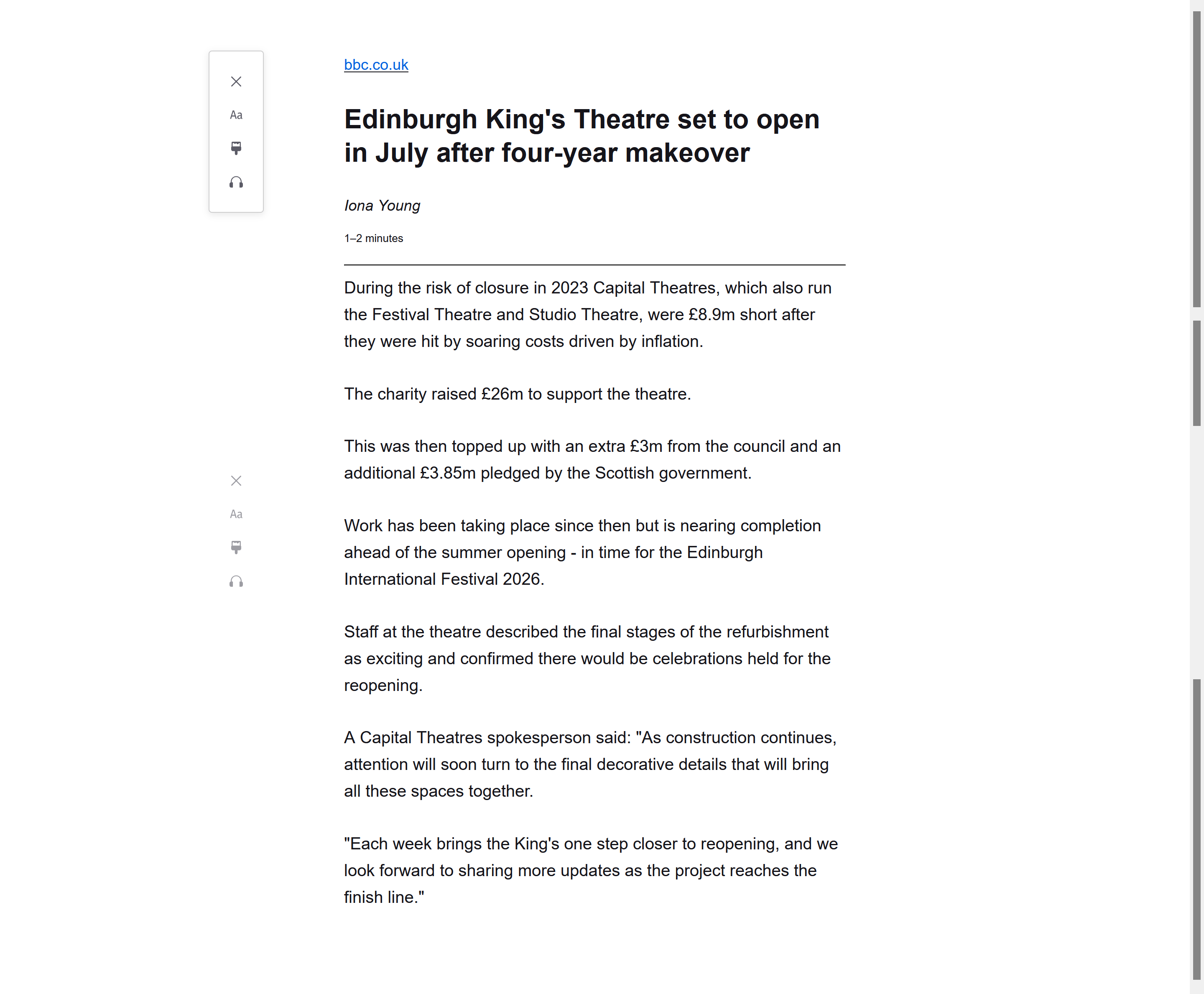 I tried using Reader view on this article on the BBC website: Edinburgh King's Theatre set to open in July after four-year makeover https://www.bbc.co.uk/news/articles/c74vz2jve80o