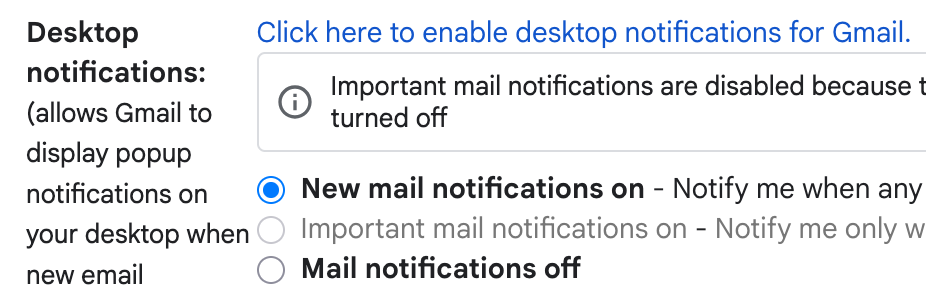If not, make sure "Block new requests asking to allow notifications" is unchecked. Then reload Gmail and in the notification settings you will have the option to "Click to enable desktop notifications for Gmail."