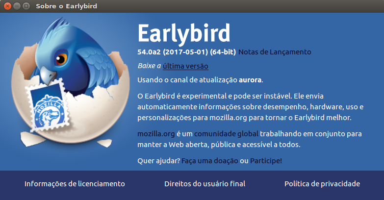 Aqui está da mesma forma e, o Earlybird diz que existe atualização à ser feita, mas na verdade não existe. Na verdade ele nos informa sobre a versão estável Thunderbird, mesmo sendo a versão Earlybird instalada.