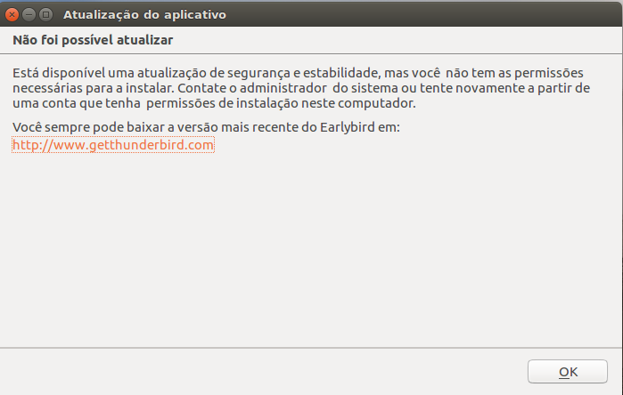 Removi o Thunderbird tradicional versão 52.0.1 para instalar o Earlybird 54.0a2 (2017-05-01) (64-bit), onde consegui atualizar ok no Ubuntu 16.04 LTS, só que, aparece pedido para atualizar esta versão sendo que não existe mais versão a ser instalada, conforme pode ser visto em imagem anexa.