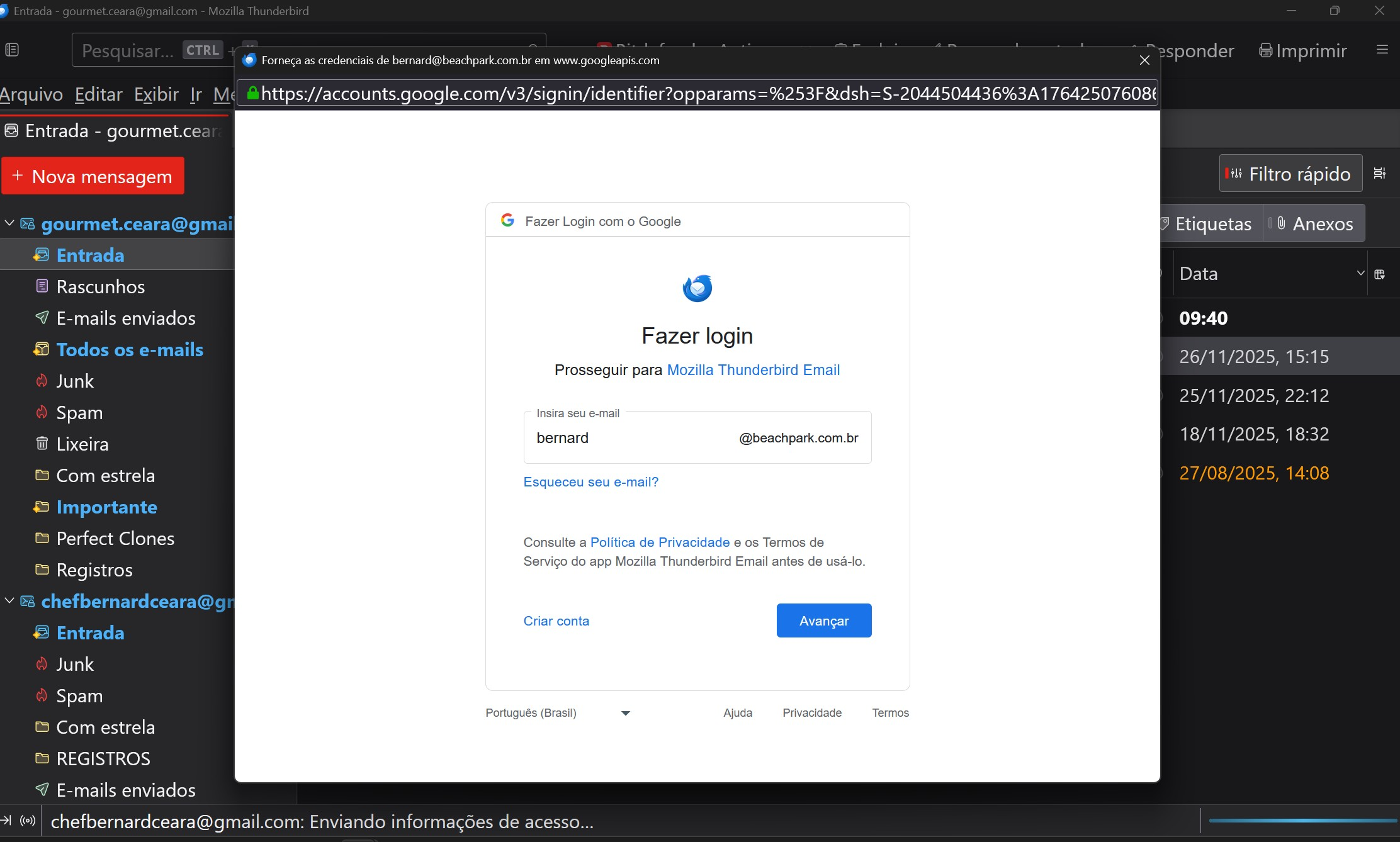 Bom dia! A conta desativada que aparece no print da janela anexada, está gerando a cada abertura do ThunderBird esta janela. Como faço para desativar ela? Muito obrigado!