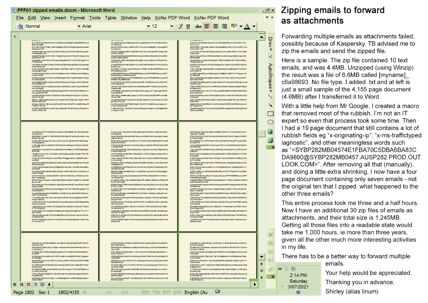 With a little help from Mr Google, I created a macro that removed most of the rubbish. I’m not an IT expert so even that process took some time. Then I had a 19 page document that still contained a lot of rubbish fields eg “x-originating-ip”, “x-ms-traffictypediagnostic”, and other meaningless words such as “<SYBP282MB04574E1FBA70 C5DBA6BA83CDA9890@SYBP282MB0457.AUSP282.PROD. OUTLOOK.COM>”. After removing all that (manually), and doing a little extra shrinking, I now have a four page document containing only seven emails - not the original ten that I zipped. what happened to the other three emails?
