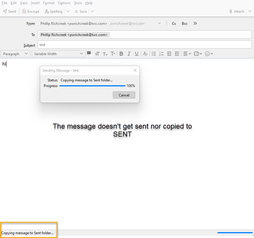 I am seeing TB on the laptop. However, when I try to send an email from the laptop, it stalls copying the message to sent folder.