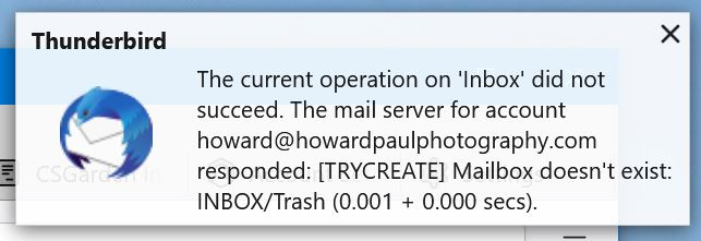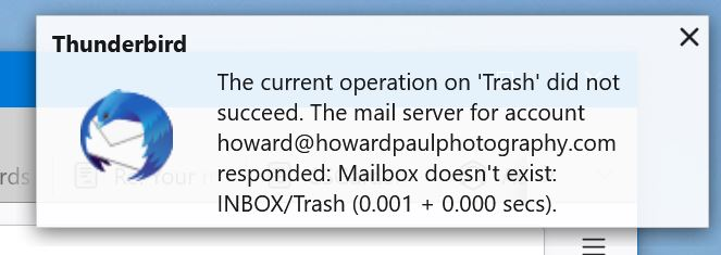 After the recent background update, one of my email accounts failed. After talking with Network Solutions (my ISP on that account) I had to reconfigure server settings. Now that it is working again, I find that I am unable to delete messages because "Trash does not exist." See the attached error message screenshot.