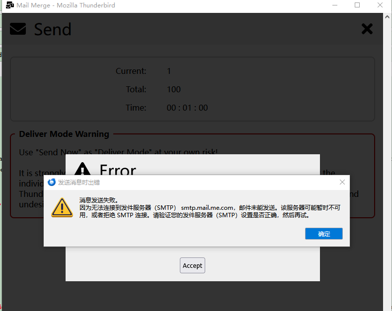 I would like to know whether the Thunderbird supports sending mass emails via Mai Merge with iCloud.com. When I use my email (xuweikang2015@icloud .com) and try to send messages via Mail Merge in Thunderbird, it has an error. It shows the message sending failed. Because it couldn't connect to the sending server (SMTP) smtp.mail.me.com, the email couldn't be sent. The server might be temporarily unavailable or refuse the SMTP connection. Please verify whether your sending server (SMTP) settings are correct and try again.