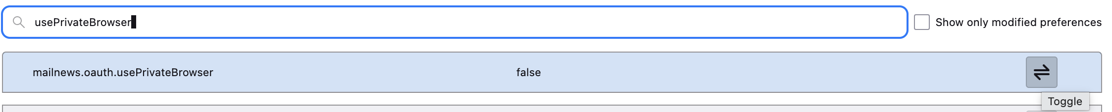 - find mailnews.oauth.usePrivateBrowser (screen shot below - you can paste it into the search field)