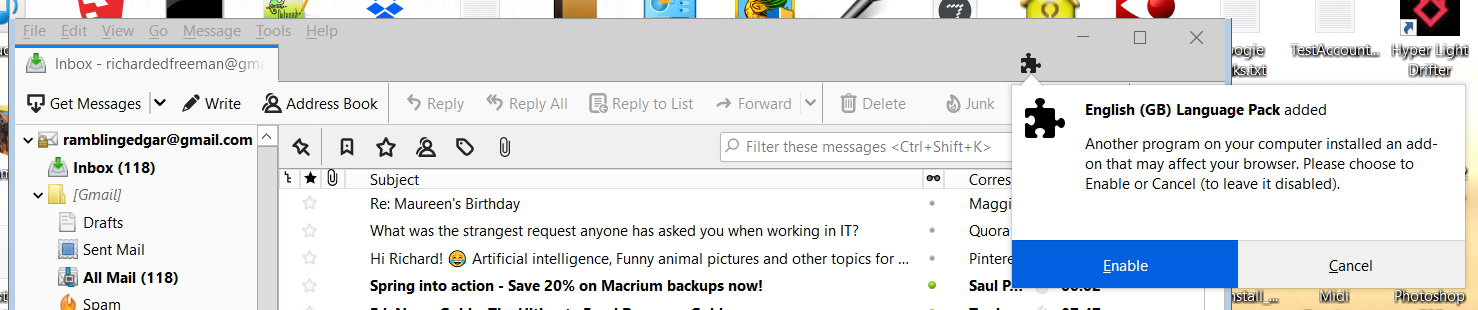I restore the 5 extensions, and now thunderbird does start normally, except there is an error message about the English (GB) Language pack - which is the second image below. I click enable for this, and get the same message for the other add-ons - which I also enable. After the last of these thunderbird restarts and appears to be normal.