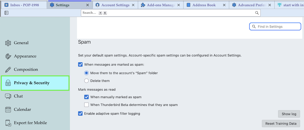 You must enable Spam (Junk) settings for each of your accounts: Go to Account Settings >[Account name] > Spam Settings ... (see first picture) Then click on "Global Spam Settings..." in the lower right corner which will open the Settings > Privacy & Security > Spam settings (second picture)