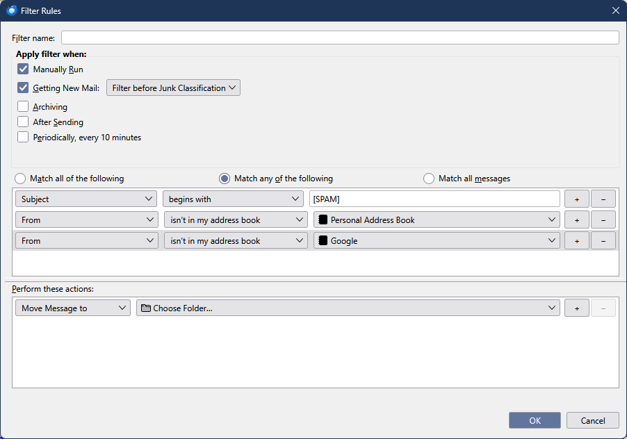 I've read this is a common issue but hoping maybe things have changed? Trying to make a filter that says move to the junk folder email where subject starts [SPAM] (the hosting service adds that) UNLESS the address is in an address book, BUT I also need to accept everything from numerous domains. I see work arounds "if the address ends in @somedomain.com" but then I'd have to do that for every domain I want to receive from. Any email from any address where I have put *@domain.com in my address book should be let through. But I know TB doesn't accept wild cards in the address book. There MUST be some way around this? Thanks.