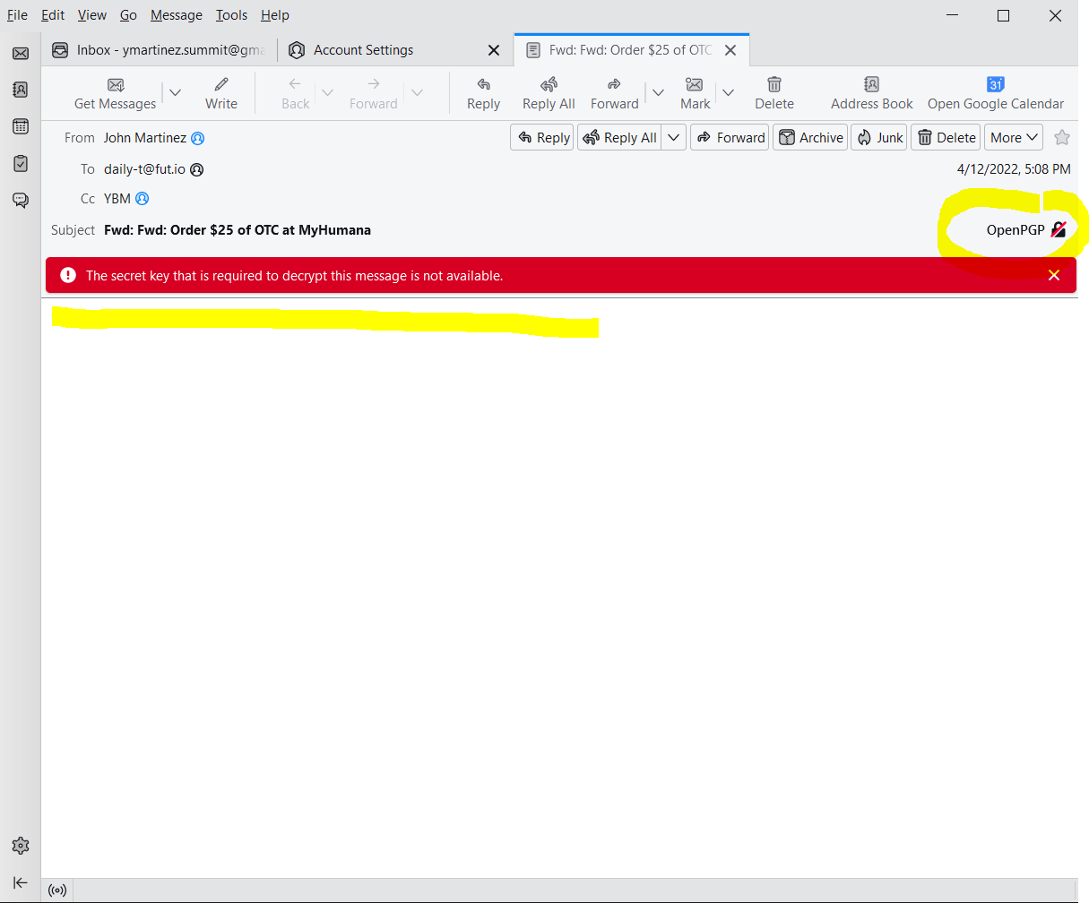 Hello. I've been using OpenPGP End-to-end encryption with Thunderbird for 2+ years. It's work flawlessly. Only use it between computers #1 (mine) & #2 (wife's). #2 had a unrecoverable crash. replaced it with computer #3 and download the backup person key to Thunderbird. Cannot get it to work. All emails I've sent prior to and since crash have the following error message: The secret key that is required to decrypt this message is not available.