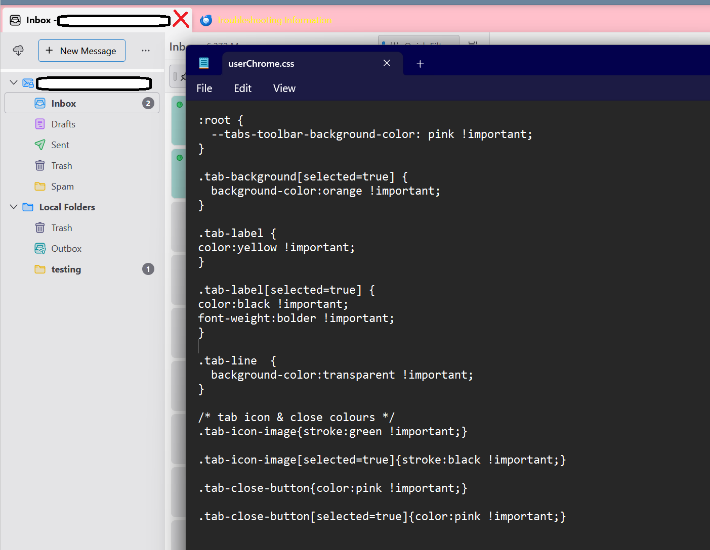 I only have 1. It must be the right profile because when I add those other codes they immediately work, I can remove them , close Thunderbird, reopen and it works. And it's the same CSS file. It's just the tab background code that doesn't do anything.