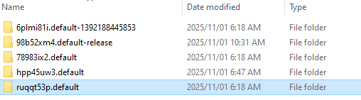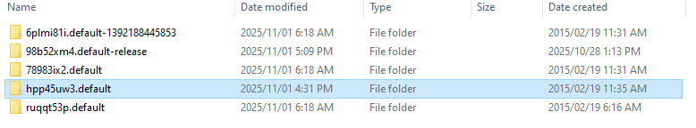 To be certain that hpp45uw3.default is the folder of the active profile open the Mail folder, open one of its "pop.xxx.xx" subfolders and look up the modification date of the Inbox file. It should be around the end of October, 2025. If there are several "pop.xxx.xx" subfolders in Mail, do this for several Inbox files.