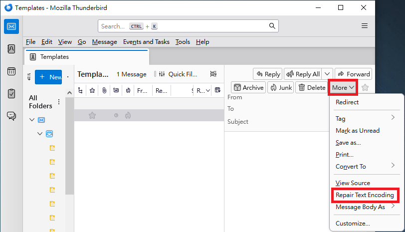 The following steps might be helpful: In the Message List Pane, click the message which displays garbled characters. > In the Message Pane, click "More" in the upper right corner. > Click "Repair Text Encoding".