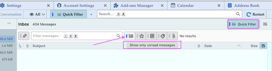 Only unread messages are showing in my inbox. It says all other messages are being filtered out. I have not initiated any filters. Read messages that have not been deleted are nowhere to be found. Deleted messages are in the deleted message folder.