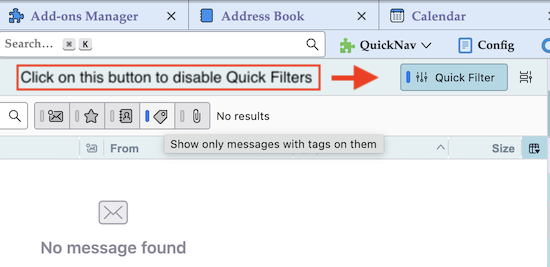That is on my iphone. I have looked on my pc and can't find anything to do with a quick filter bar. On my iphone, when I go to the inbox it says at the bottom left "Filtered by Unreadv" in blue. When I hit that it goes to a Filters screen where unread is checked. When I hit the checkmark it goes away and then I hit a larger blue check in the upper right hand corner to execute but it does not remove the check and goes back to the inbox screen where is continues to say "Filtered by: Unreadv. In any case if I could go to the pc and turn it off that would be good. But I can't find where to do that in the program on the pc. (I appreciate your help-thank you).