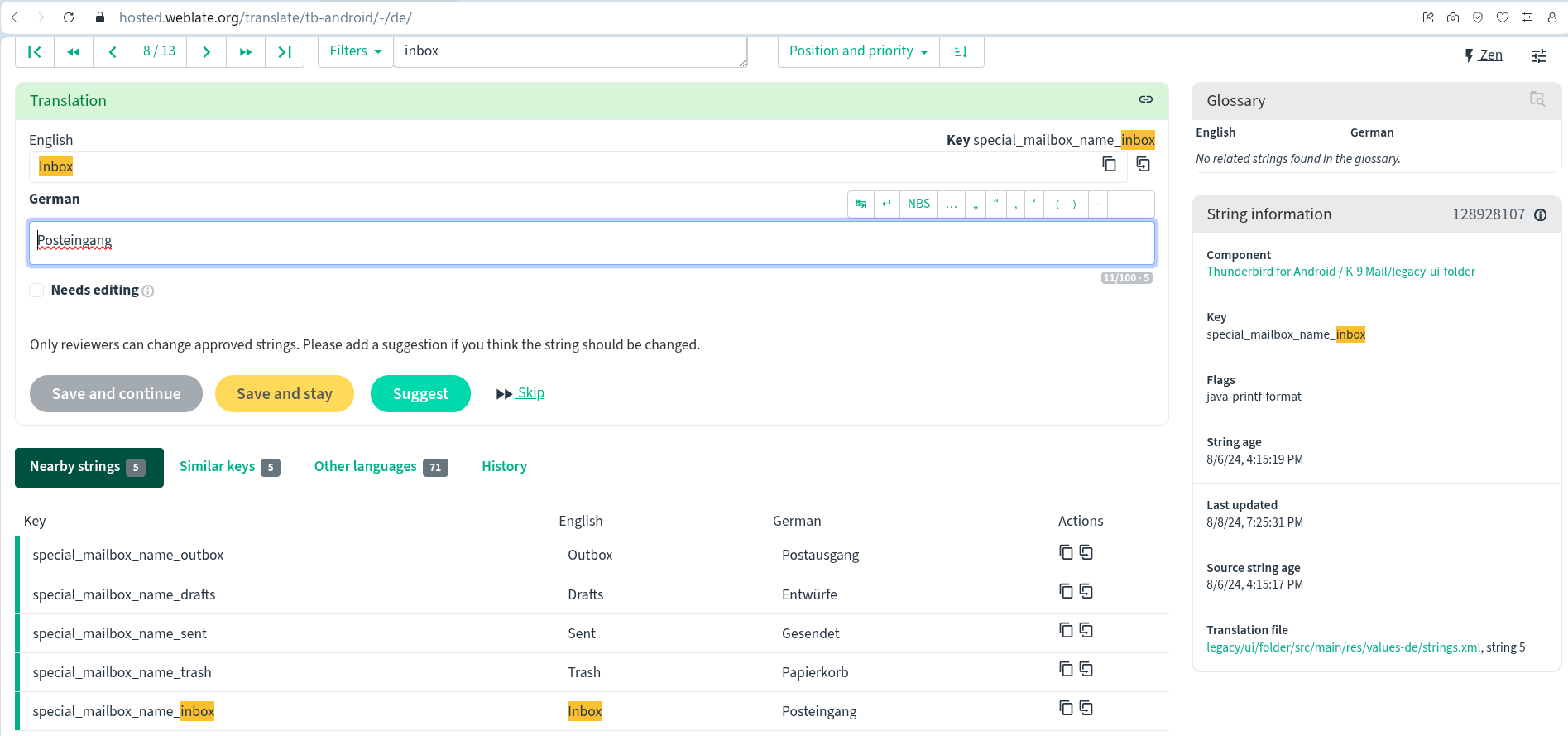 I can see the german translation of the special folders are 100% complete on weblate and the code's string file below.