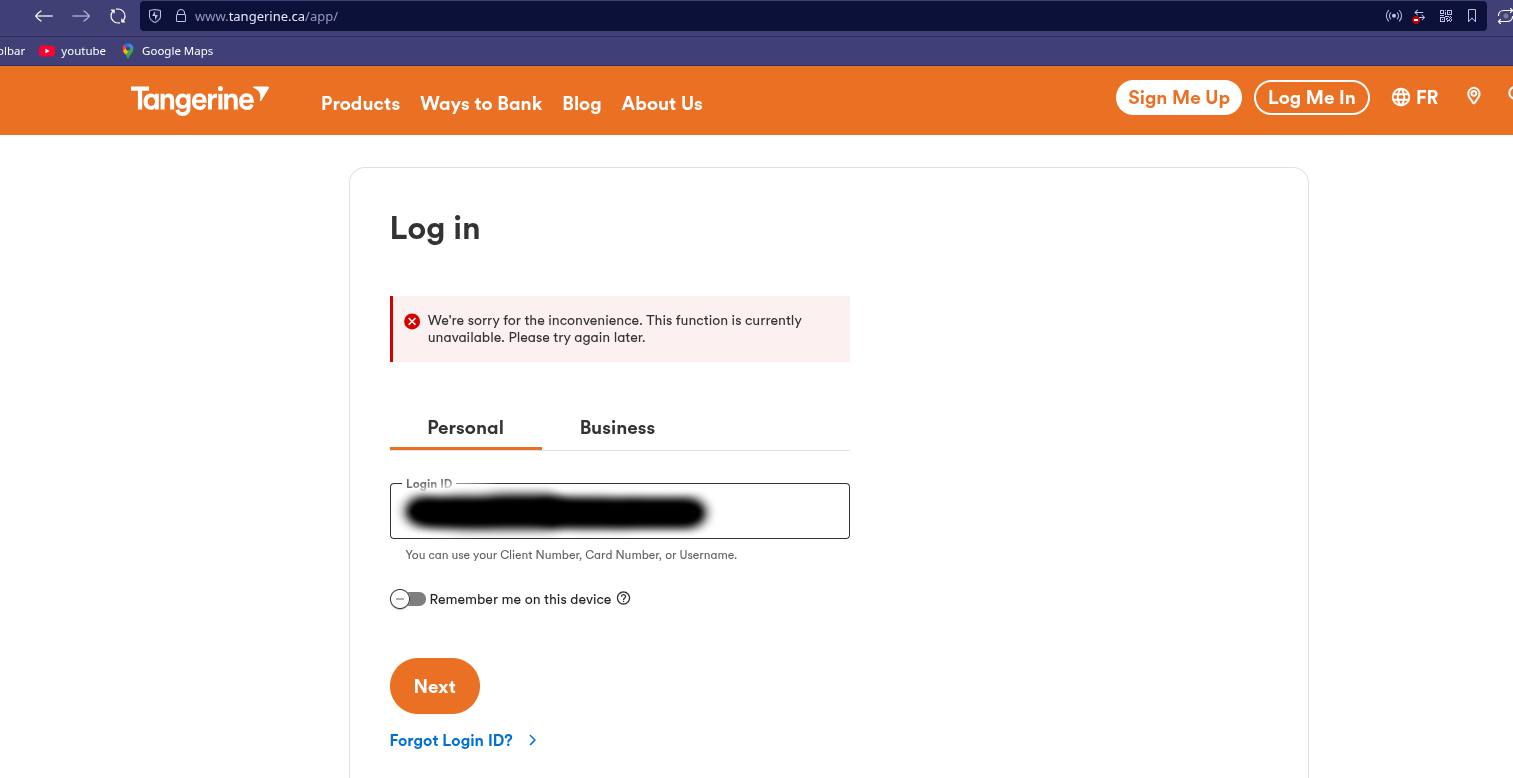 When I try to log into Tangerine bank I get the error. "We're sorry for the inconvenience. This function is currently unavailable. Please try again later."