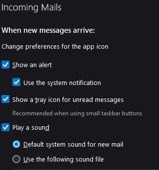 This works now but only if 'Use the system notification' is enabled in Settings/General/Incoming Mails.
