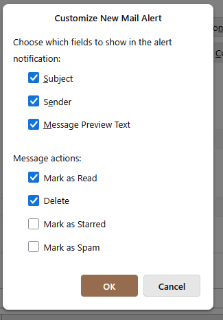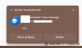 When I have Thunderbird desktop running but I am focused in another application, I receive a popup notification when a new email is received. In the popup, there is an X to make the notification disappear, but it would be very handy if there was also a trash can icon where, if you clicked on it, the message would be deleted from your inbox without having to go back to the TB app. I didn't see any such options in TB settings, and I have searched the forum to no avail. Is this possible? Thank you.