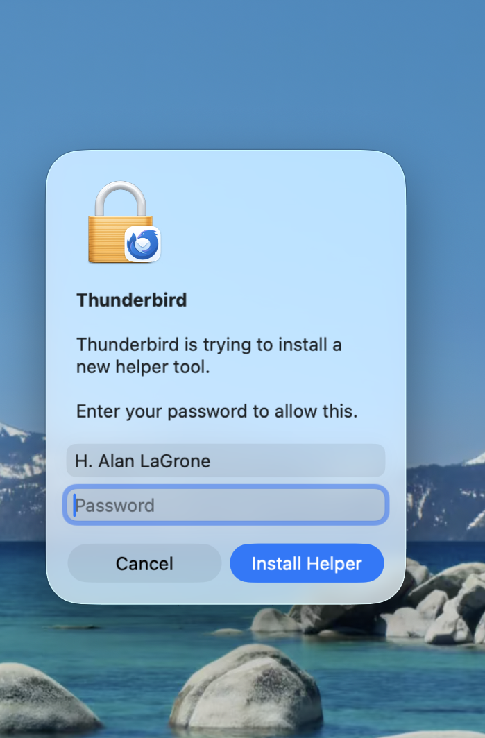 When I try to open Thunderbird it keeps giving me a message that it is trying trouble install a new helper tool and asks for my password. I do so, hit the Install Helper button, and then nothing ever happens. I get a spinning beach ball and it never opens no long how I wait. I would be very grateful for any suggestions or advice on what to do.