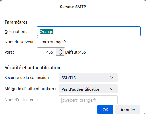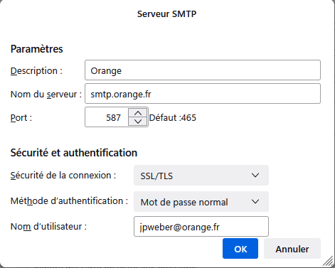Try these settings: smtp.orange.fr on port 587, STARTTLS security, authentication = normal password, User Name = email address.