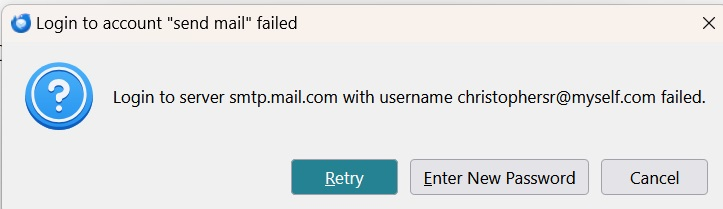I shut off my firewall. I shut off my anti-virus. We tried SSL, we tried STARTTLS. Just won't send. Said to check password, we did that. I sent mail.com screenshots of all my settings. They say it is all right. I can get mail from them but can't send. I needed POP3 to make sure I could save all the important emails to my computer AND offsite backup.
