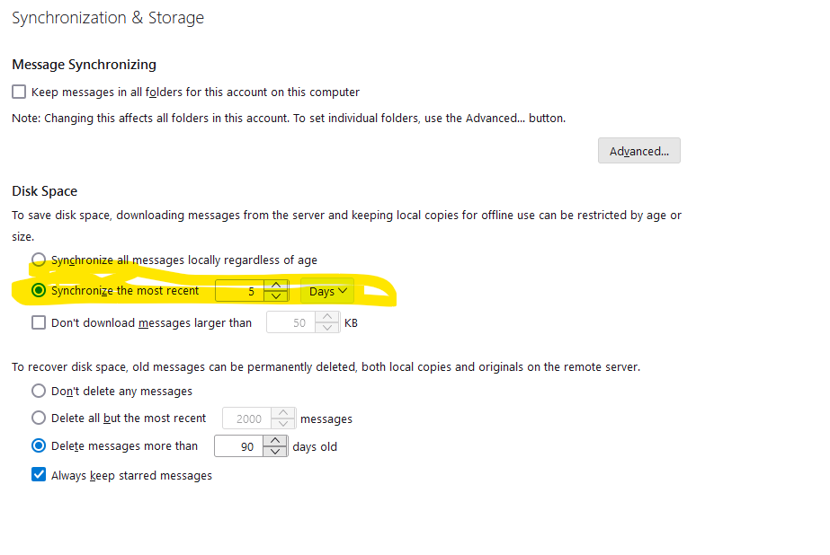This is what I have currently. All folders have been unticked in Synchronization & Storage -> Advanced I have changed the "Synchonize the most recent" from 30 days to 5 days My imap folder has 22.1gb, the exact same as it was previously