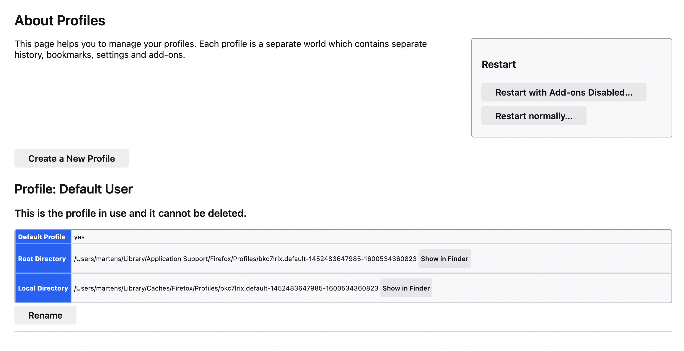 Then I again entered about:profiles and the window that showed on my Mac was totally self-explanatory, see attached, including the helpful "Show in Finder" buttons. I moved the profile from "Old FireFox" to the Profile folder, and set it as default.