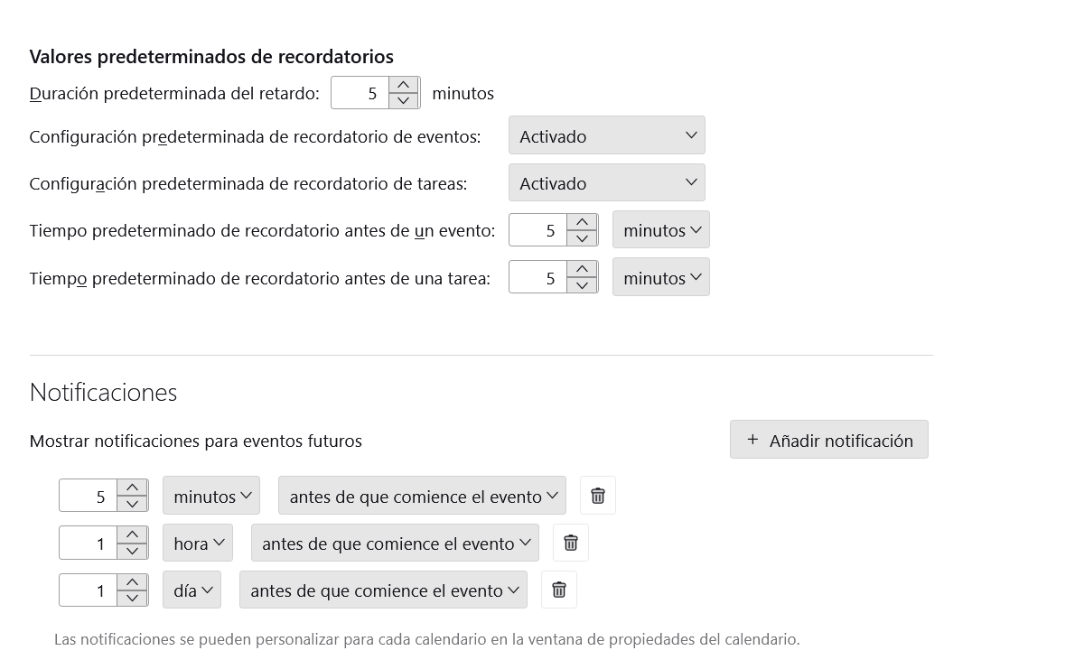 Apparently it's possible to select different notifications or warnigs for events, it is possible to define one time by default, but also add anothers, but that does not work at all, it only accepts the one selected in calendar.alarms.eventalarmlen