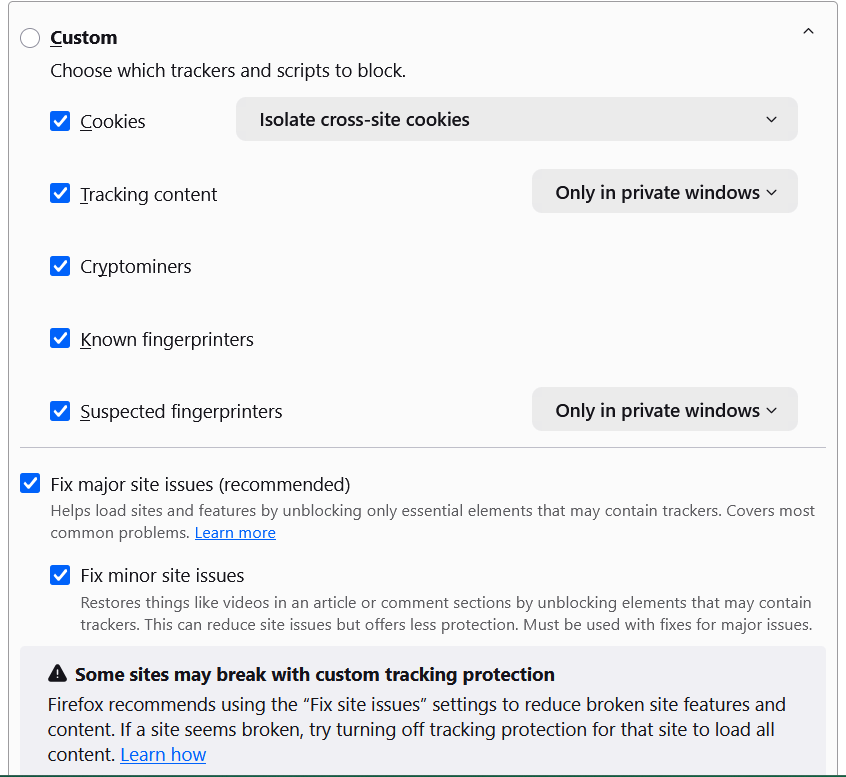 I use Standard tracking protection. Not tech savvy enough to understand any custom or strict levels. If it's of any help, here's a screenshot of the default custom options, I haven't made any changes on this, is there anything here that would prevent Youtube from opening a sign-in page?