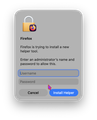 I have an iMac M4 running Tahoe 26.2, which has an admin account and three user accounts. Last time I tried to open Firefox in one of the user accounts, it asked for an admin password to install a helper, presumably to update. Rather than responding, I switched to the admin account and updated Firefox manually, (from the "about" option). If I now try to open Firefox back on the user account, I still get that request, but even after I enter the admin credentials, Firefox won't open. It does however open on the admin account and the other two user accounts, not getting the "helper" window at all. I have reinstalled Firefox (twice), and removed the profile form the troublesome user account, but the problem recurs. Where is the problem and how do I fix it?