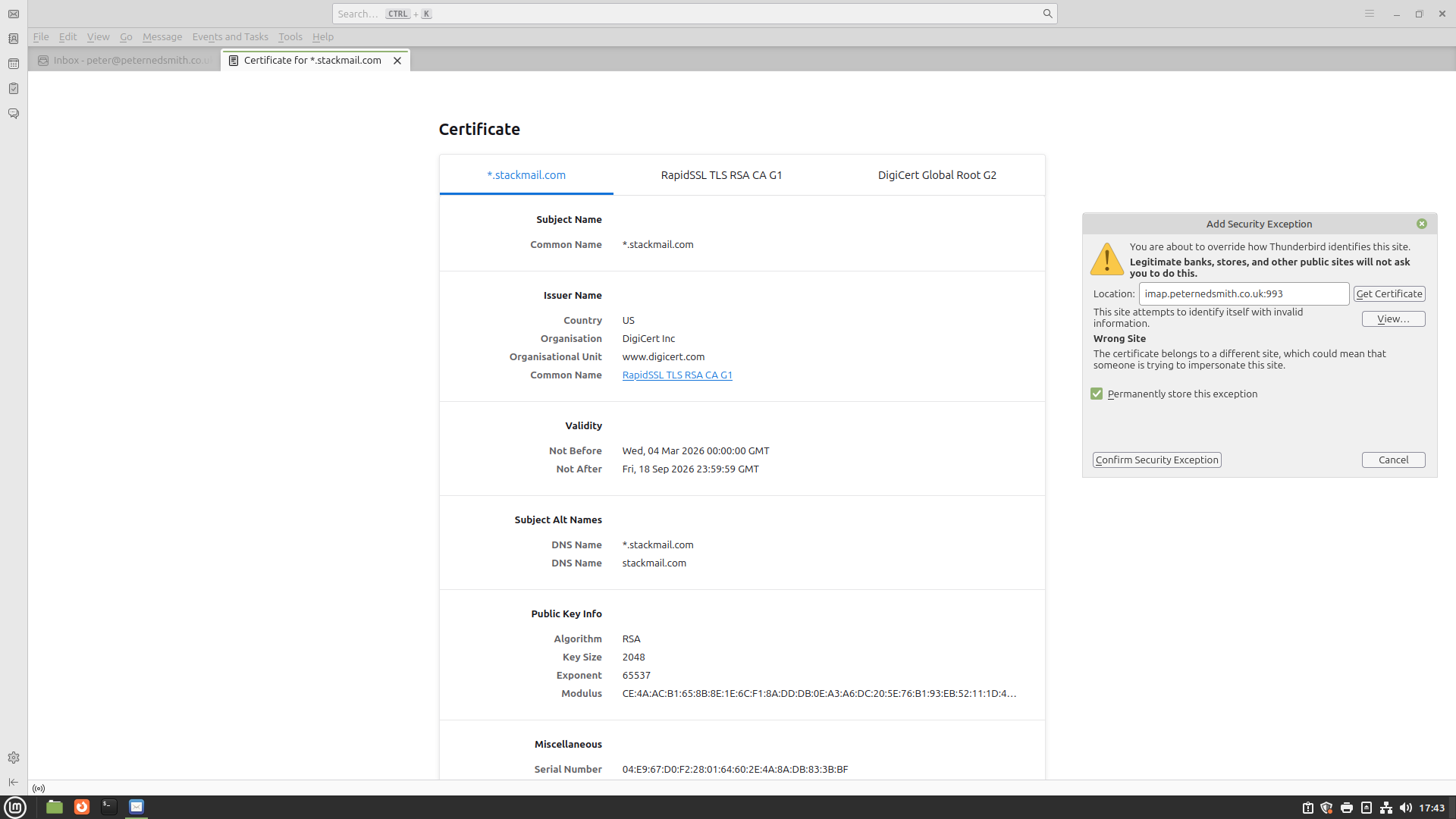 The certificate has been issued for stackmail.com. However, with Thunderbird you're connecting to the server imap.peternedsmith.co.uk. There is a mismatch, hence you do get the exception prompt. Check with your email/hosting provider about the correct email server settings for your domain, or have them fix their certificate.