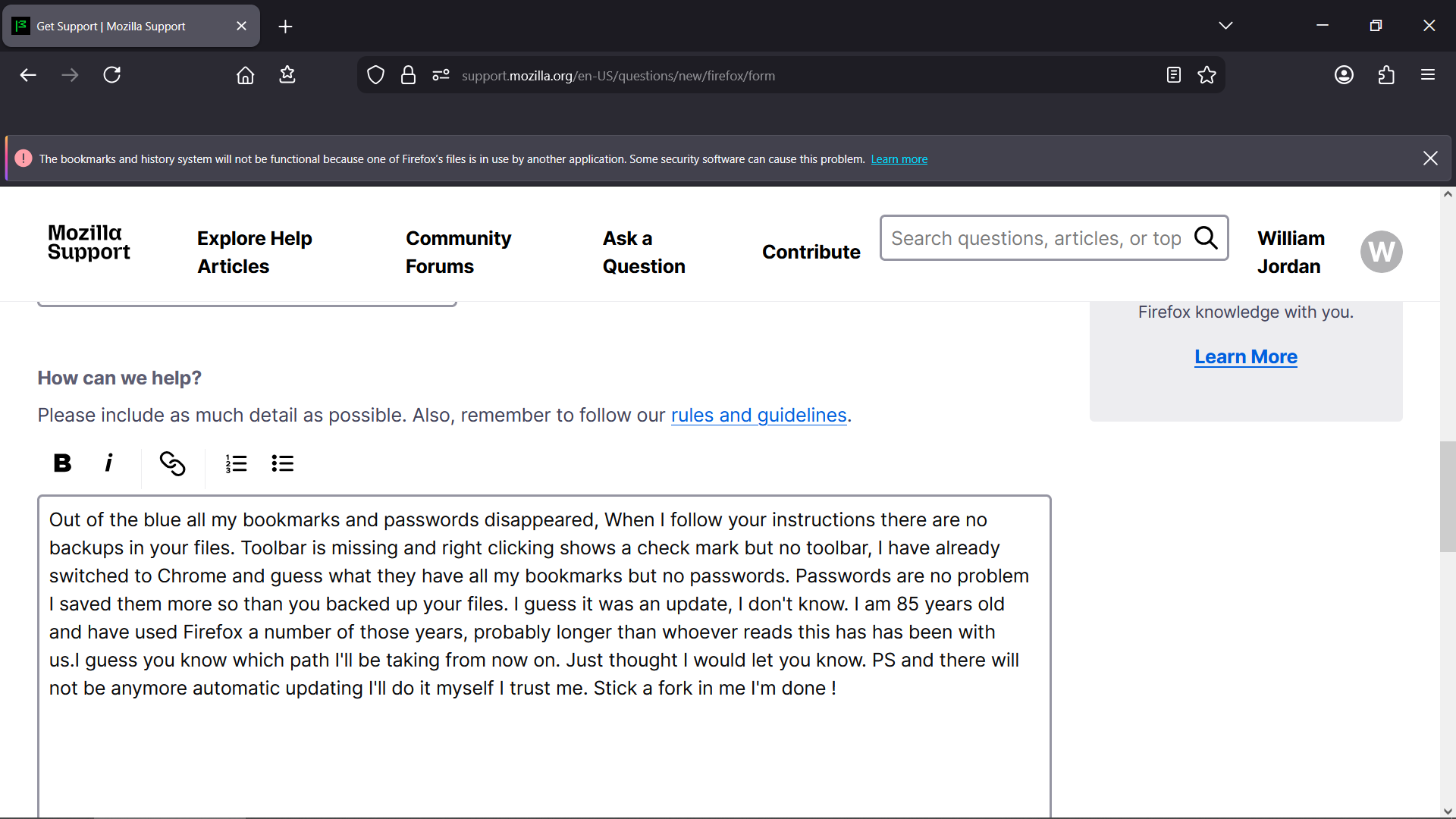 Out of the blue all my bookmarks and passwords disappeared, When I follow your instructions there are no backups in your files. Toolbar is missing and right clicking shows a check mark but no toolbar, I have already switched to Chrome and guess what they have all my bookmarks but no passwords. Passwords are no problem I saved them more so than you backed up your files. I guess it was an update, I don't know. I am 85 years old and have used Firefox a number of those years, probably longer than whoever reads this has has been with us.I guess you know which path I'll be taking from now on. Just thought I would let you know. PS and there will not be anymore automatic updating I'll do it myself I trust me. Stick a fork in me I'm done !