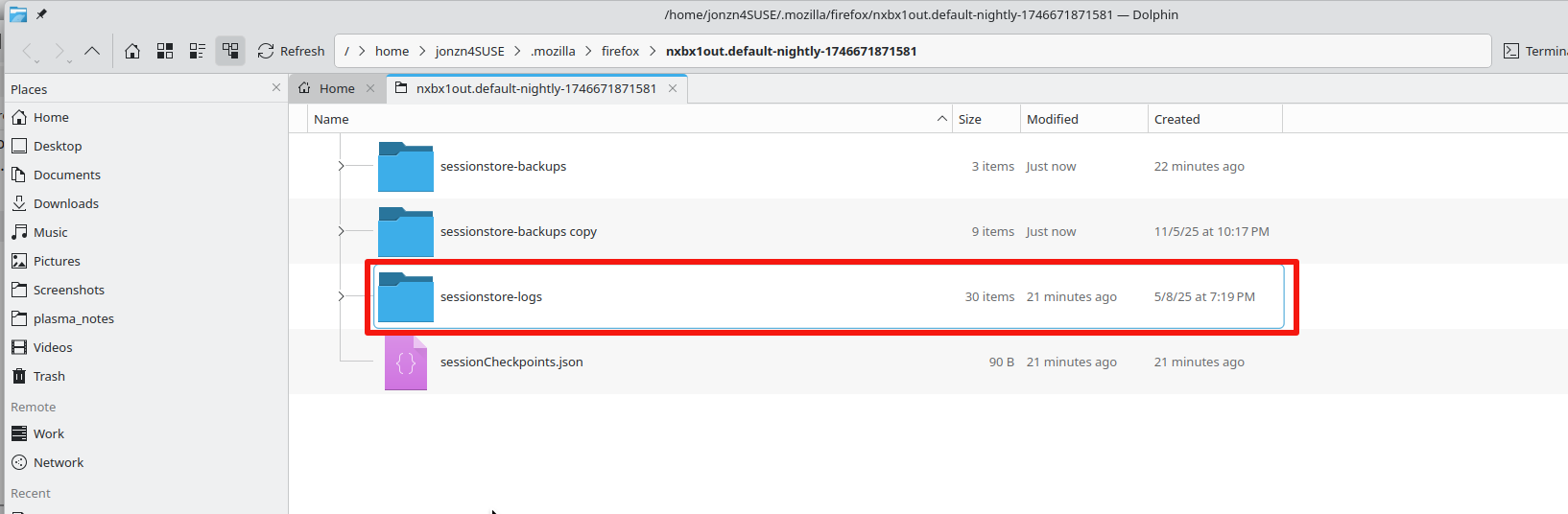 There are logs in your profile folder. see screenshot This link can help if you're trying to restore your session. https://support.mozilla.org/en-US/questions/1557927