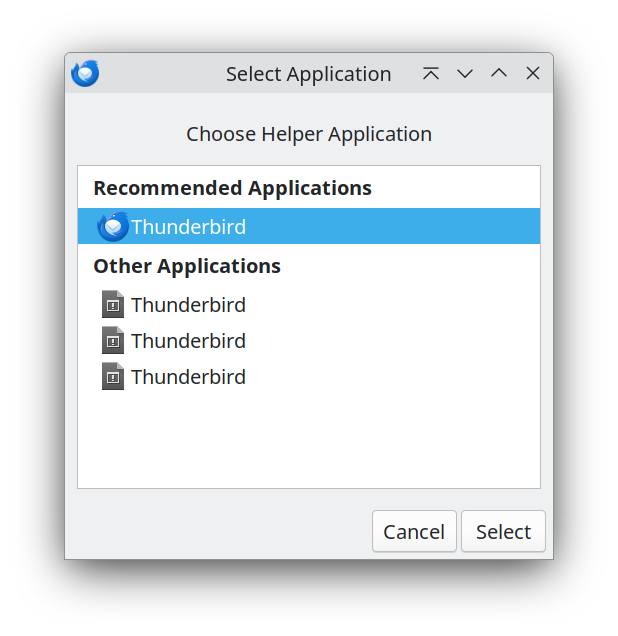 The problem appears to be that the handlers are missing and I don't know how to get them back. See screenshot in original post, there are no options other than Thunderbird, where there should be a list of applications.